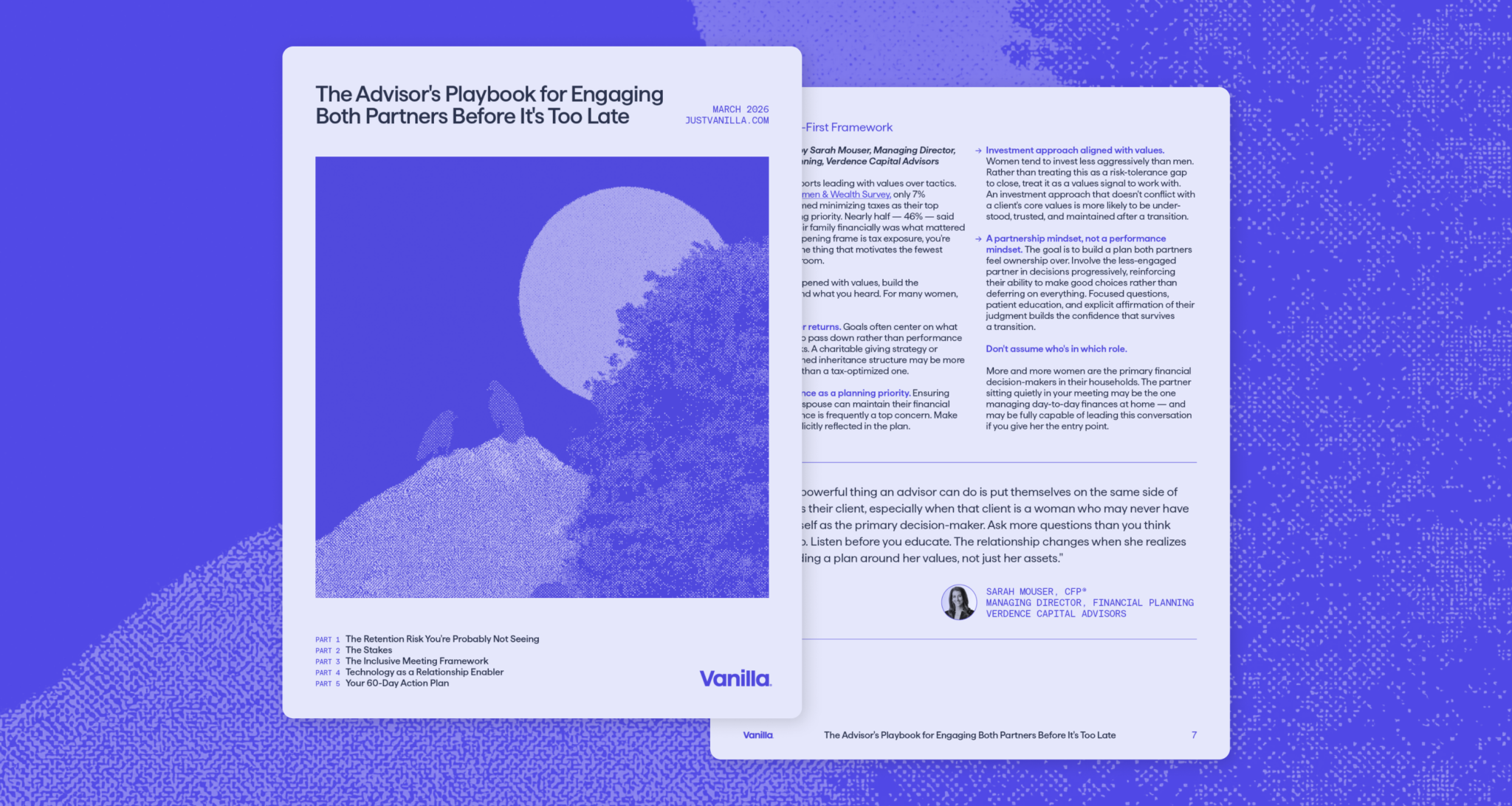 What women want from estate planning conversations — and what most advisors are missing. Vanilla’s Women & Wealth Survey asked 502 U.S. women who are the primary financial decision-makers in their households about estate planning: what they prioritize, where they feel prepared, and what they wish their advisors understood. The findings reveal a gap that’s bigger than most advisors realize, and more actionable than they might expect. This year’s key findings: Nearly 1 in 3 women with a financial advisor say estate planning has either never come up or they had to raise it themselves 46% say protecting their family...