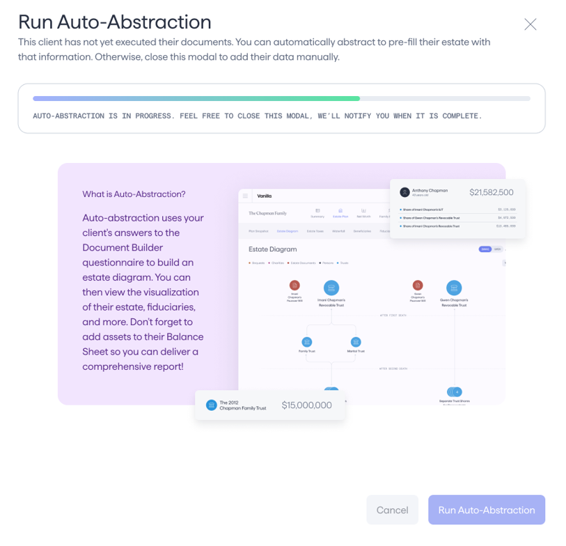 In February, we launched auto-abstraction through Vanilla Document Builder. Advisors are saving hours per client by having Vanilla automatically generate professional estate diagrams when clients complete their estate documents. Manual, time-intensive abstraction becomes a thing of the past, letting you focus on what you do best—advising clients.