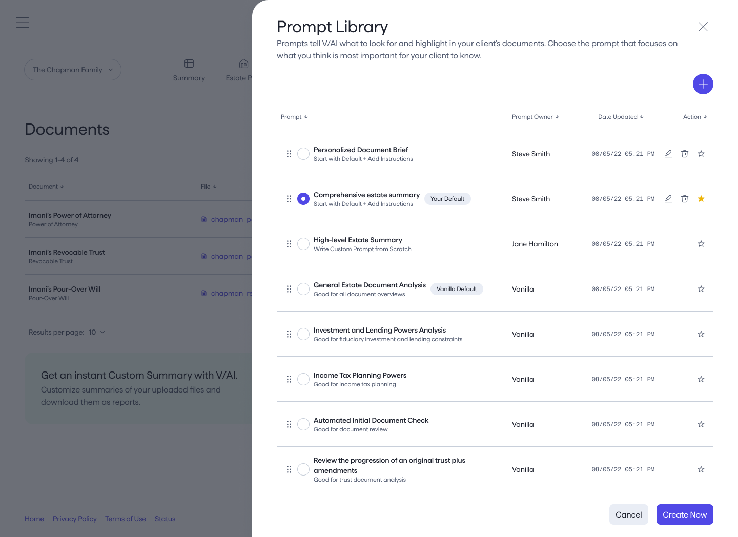 As part of our upgrade to the Custom Prompt Library, V/AI now offers professional Vanilla-authored prompts ready to use out of the box. Select your prompt before generating summaries—whether you need a general estate document analysis, trust amendment progression review, automated initial document check, income tax planning powers analysis, or investment and lending powers summary. Set your most-used prompt as the default with a single click.