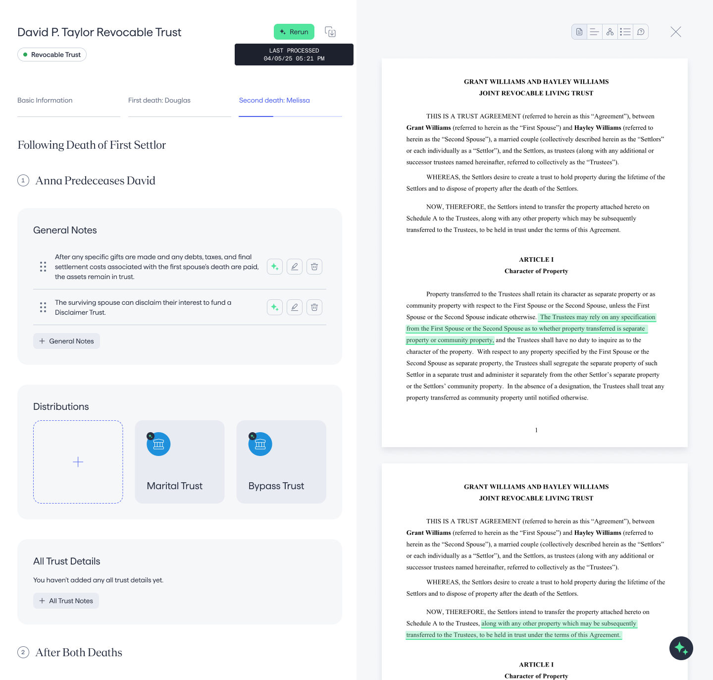 - V/AI auto-fills Estate Builder forms directly with extracted document data such as client information, fiduciaries, provision notes, distributions, and funding details