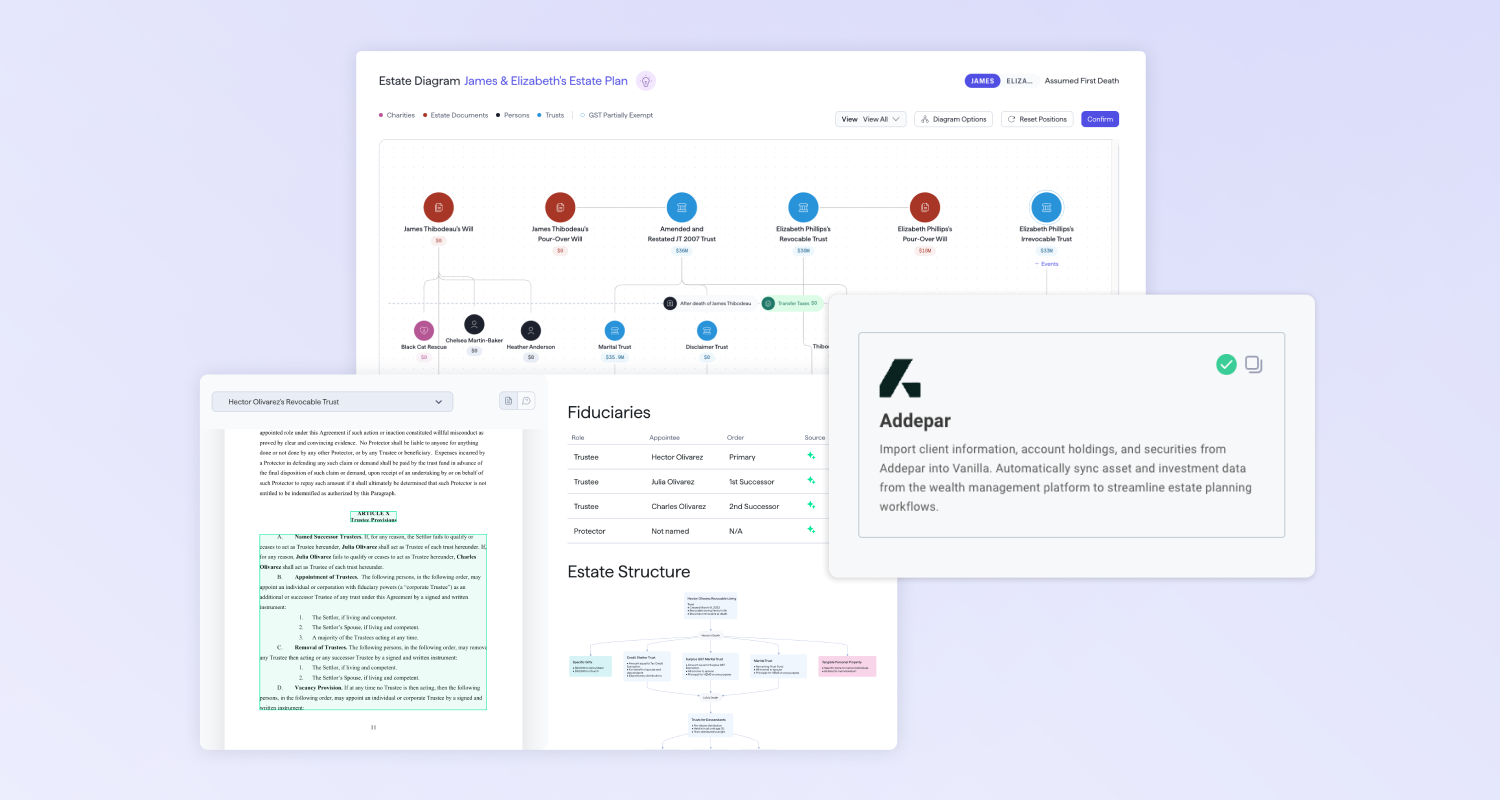 We’re launching some serious upgrades for July! This month's releases focus on expanding AI capabilities, customizing Vanilla's appearance, and enhancing your integration experience – plus, catch a special preview of our most sophisticated planning tool yet. V/AI enhancements: Your AI estate planning assistant just got smarter We’re excited to announce some game-changing updates to V/AI Copilot, and an upgraded version of V/AI Summaries this month. The Problem: Estate planning requires deep analysis across multiple data points—from financial structures to family dynamics—and advisors need AI that can provide comprehensive insights across multiple areas of a client's profile and for multiple types...